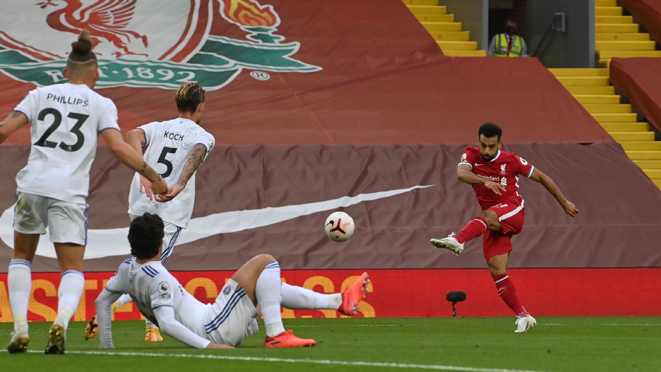 - 4': Goal! Liverpool 1, Leeds United 0. Mohamed Salah (Liverpool) converts the penalty with a left footed shot to the high centre of the goal.