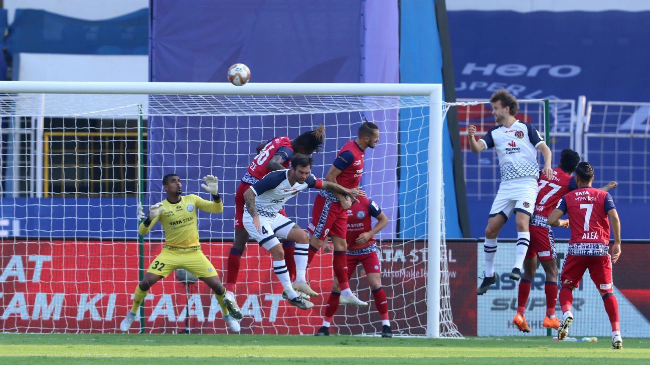 - 11': Attempt missed. Seiminlen Doungel (Jamshedpur FC) right footed shot from more than 35 yards misses to the left from a direct free kick.