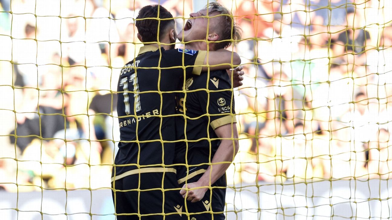 Late goals by Kasper Dolberg and Amine Gouiri earned Nice a 2-0 victory at Nantes to move into fourth place in Ligue 1 on Sunday.