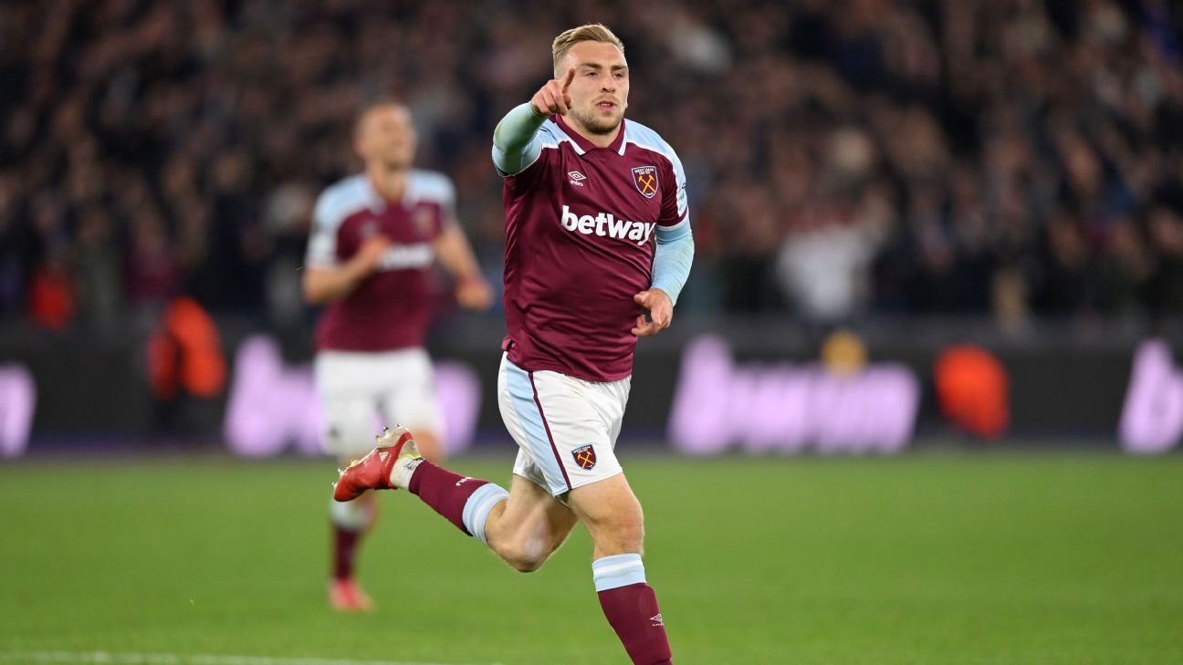 - 40': Attempt blocked. Jarrod Bowen (West Ham United) left footed shot from the left side of the box is blocked.