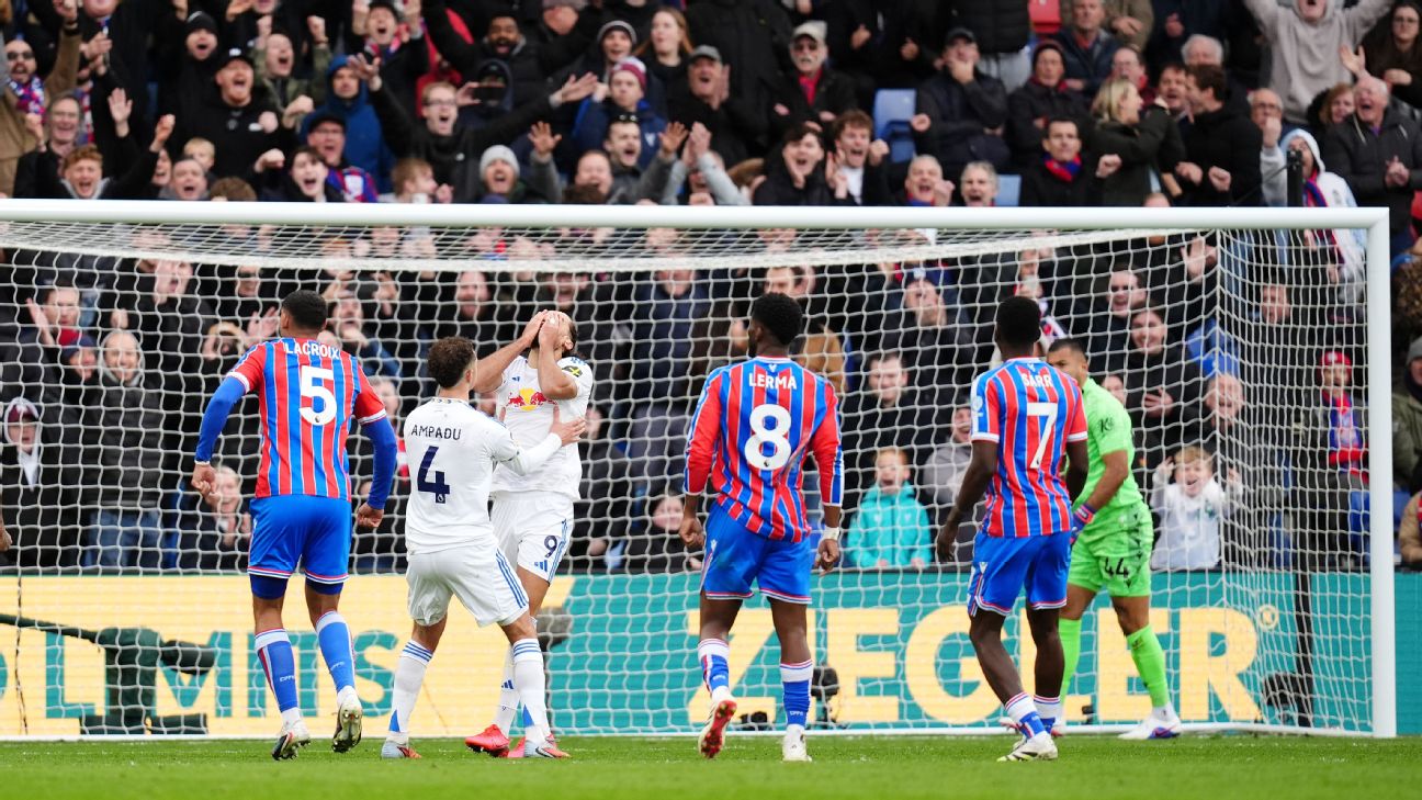 · English Premier LeagueCrystal Palace held by 10-man Leeds in goalless draw as Calvert-Lewin misses penalty